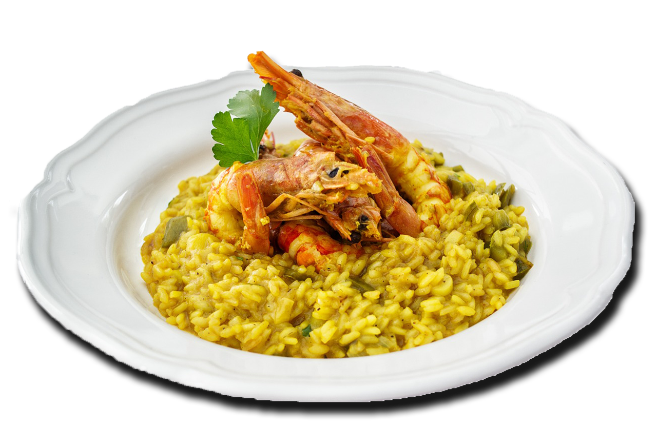 色彩鮮豔繽紛是餐點的特色。鮮黃色的米飯,紅彤彤的藍鑽蝦子,再用香菜點綴,讓人食慾大增。